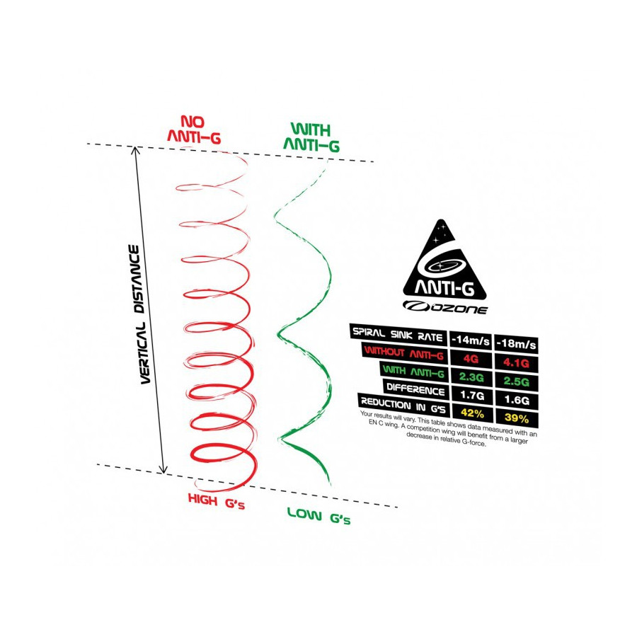 Pendant une spirale, l’efficacité de l’Anti-G est multipliée par 10 grâce à l’amélioration de la vitesse et le fait que la trainée est proportionnelle à cette dernière. Ozone ne conseille pas d’utiliser l’Anti-G en approche pour le poser, car en plus d’être inefficace il peut aussi déranger vos habitudes à l’atterrissage.
