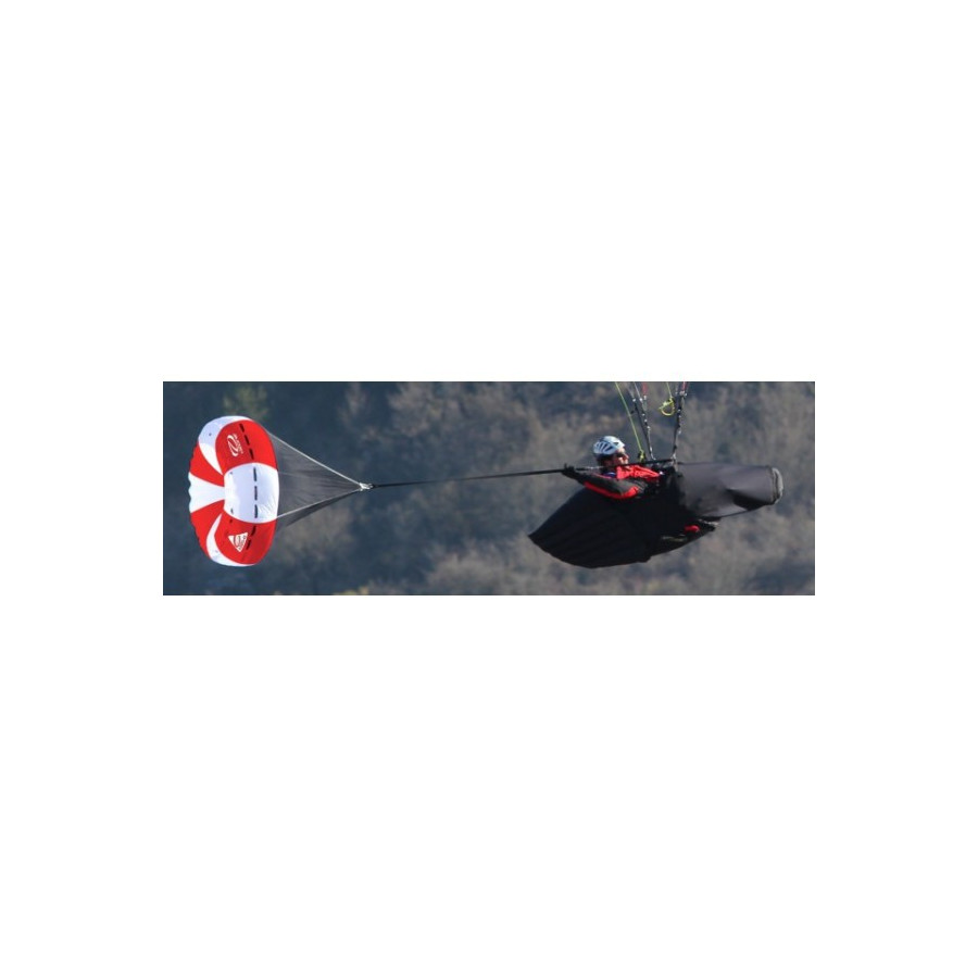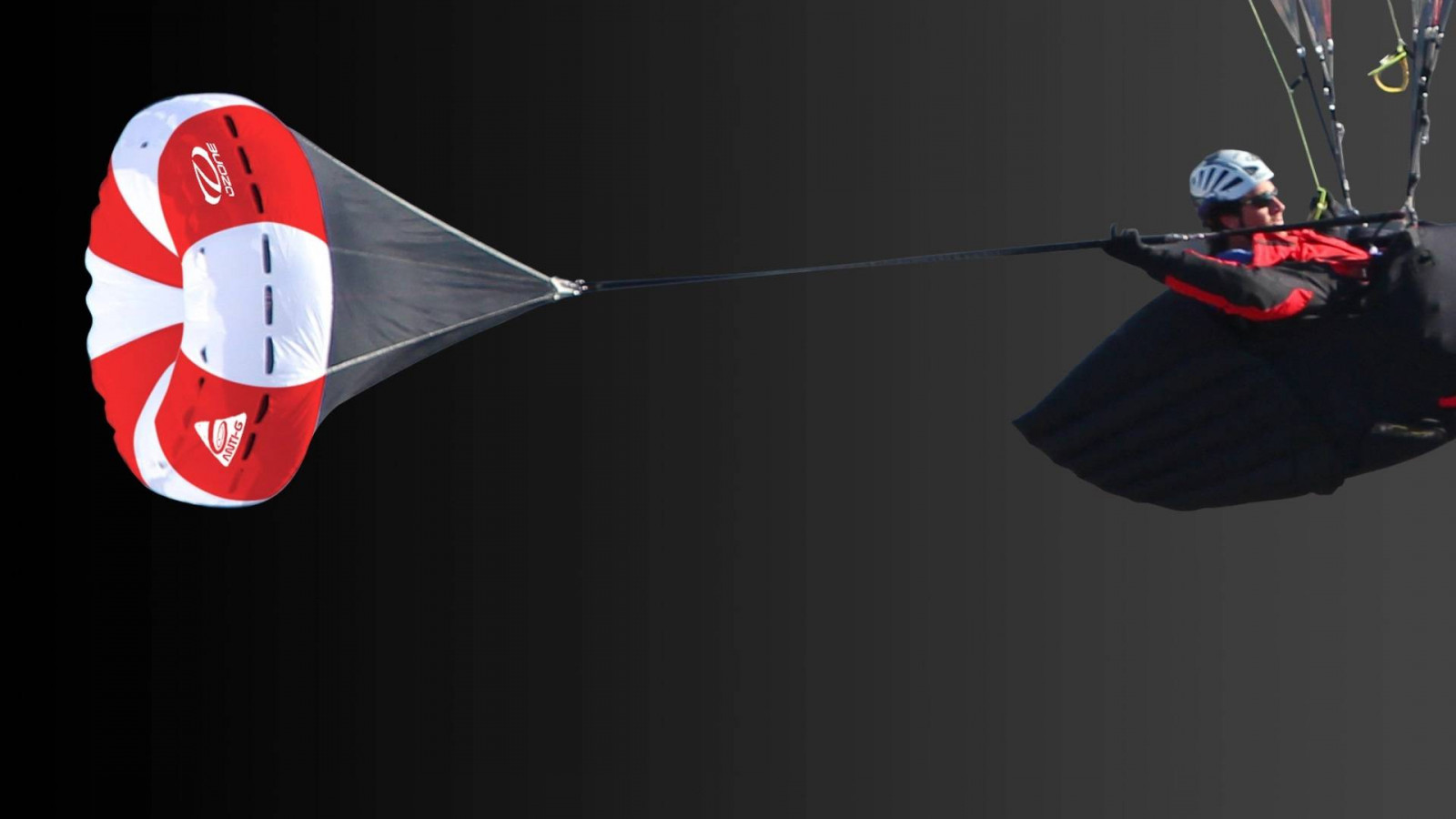 Vous pouvez descendre en spirale et atterrir normalement avec le parachute déployé. L’Anti-G a une sangle de “dévente” pour le désamorcer facilement en vol. Ozone conseille vivement cet outil pour les pilotes de compétition quelle que soit leur voile; à cause du rendement de certaines voiles où il est difficile de descendre efficacement sans force centrifuge excessive. L’Anti-G permet une descente rapide avec une faible force centrifuge pour tous types de voiles.