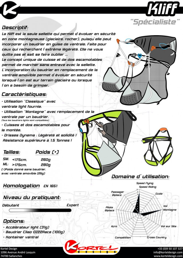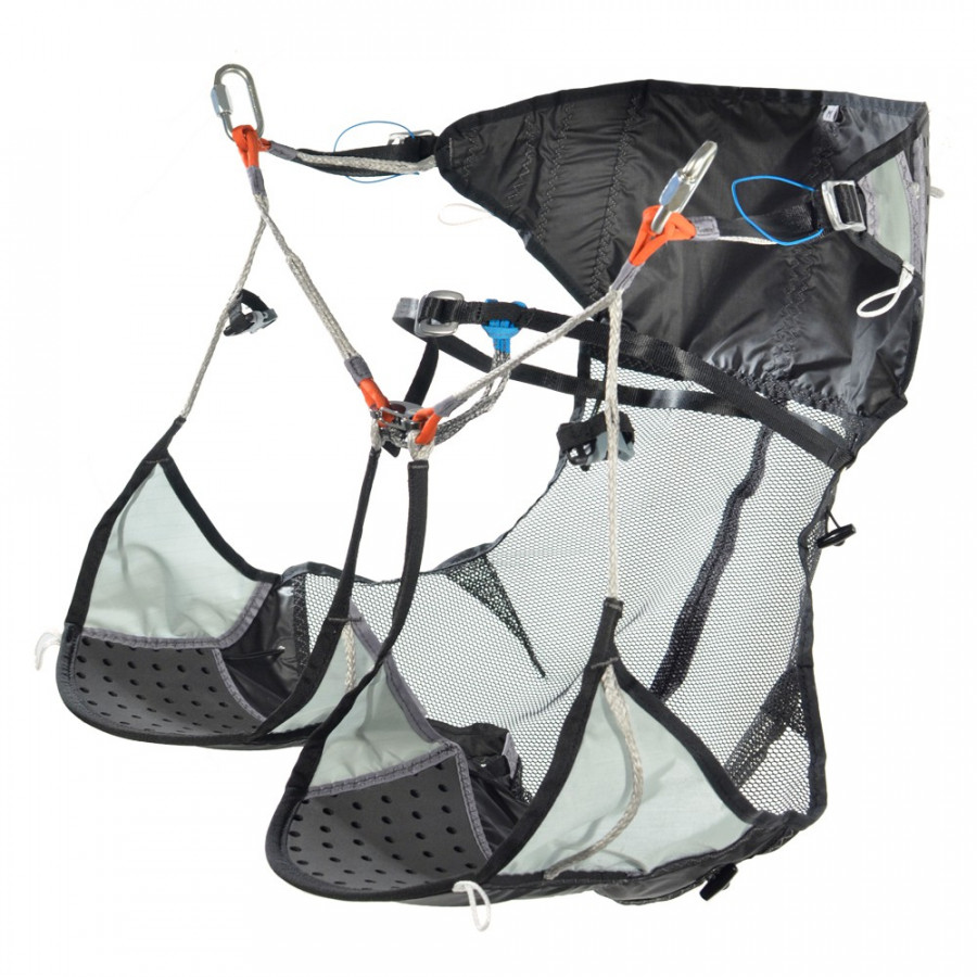 Elle reprend notamment le concept « sans bretelles » de la Karver, mais son originalité réside dans la possibilité d’y intégrer n’importe quel baudrier du marché. Celui-ci se monte en lieu et place de la ventrale light (fournie), et fais corps avec la sellette pour permettre une évolution sûre en milieu glaciaire tout en conservant la sellette sur soi pour être paré à décoller à n’importe quel moment !