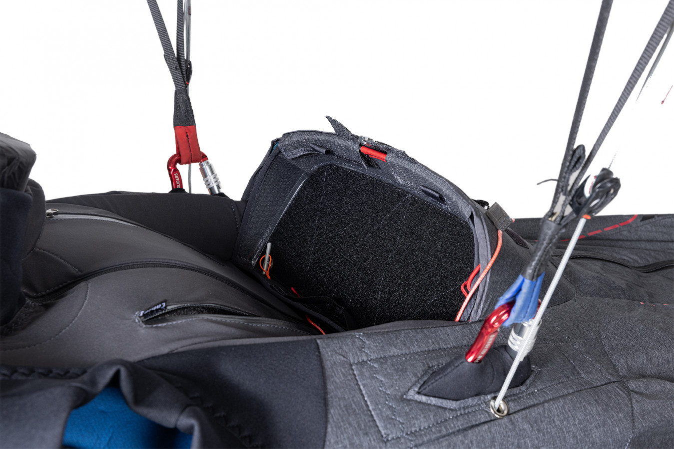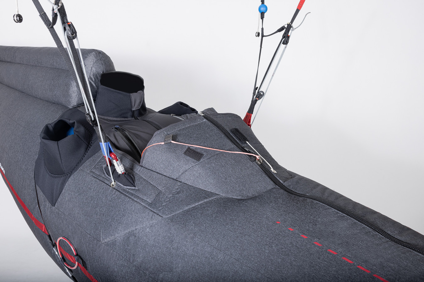 Améliorations du corps En plus de l'amélioration de l'enveloppe, le corps du cocon a également été mis à jour à partir de 2025. Un tissu plus robuste entoure désormais la plaque de pied, et une poulie à cliquet Ronstan 40 mm améliorée avec un système d'attache facile a été ajoutée à la ligne de vitesse. Poche G-chute Il y a une nouvelle poche sur le côté gauche de la poitrine, avec un système d'attache pour l'utilisation d'un parachute de traction. |