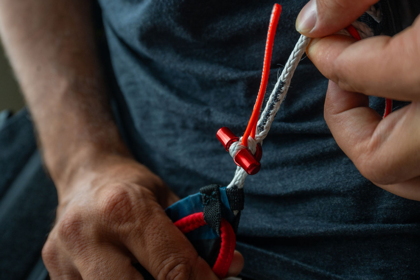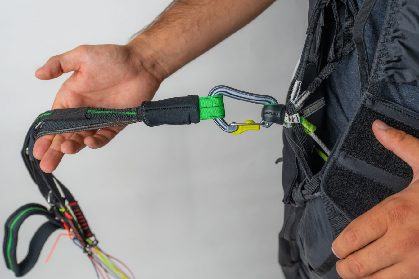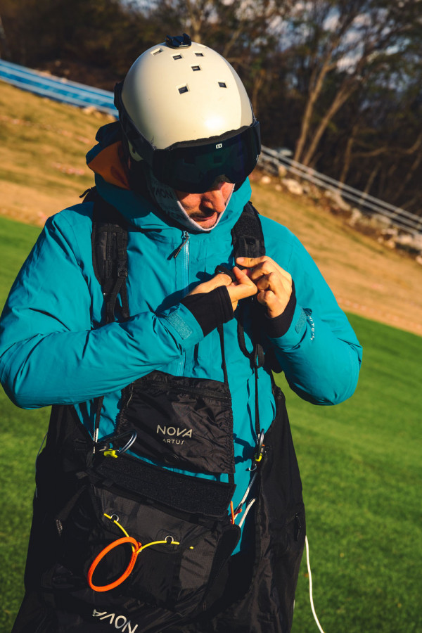 Prêt pour le décollage. Il est important de fermer correctement l'Artus pour pouvoir décoller rapidement et en toute sécurité. Le diagramme sur les boucles de jambes vous montre comment connecter correctement les sangles colorées avec les tiges métalliques correspondantes et les anneaux. Le codage couleur pour chaque côté correspond au schéma familier que l'on trouve sur la plupart des parapentes NOVA, ce qui évite la possibilité de fixation incorrecte : rouge pour la gauche et vert pour la droite. Les mousquetons EASE Aerotec d'Edelrid, spécialement développés pour le parapente, garantissent un poids minimum avec une résistance maximale. |