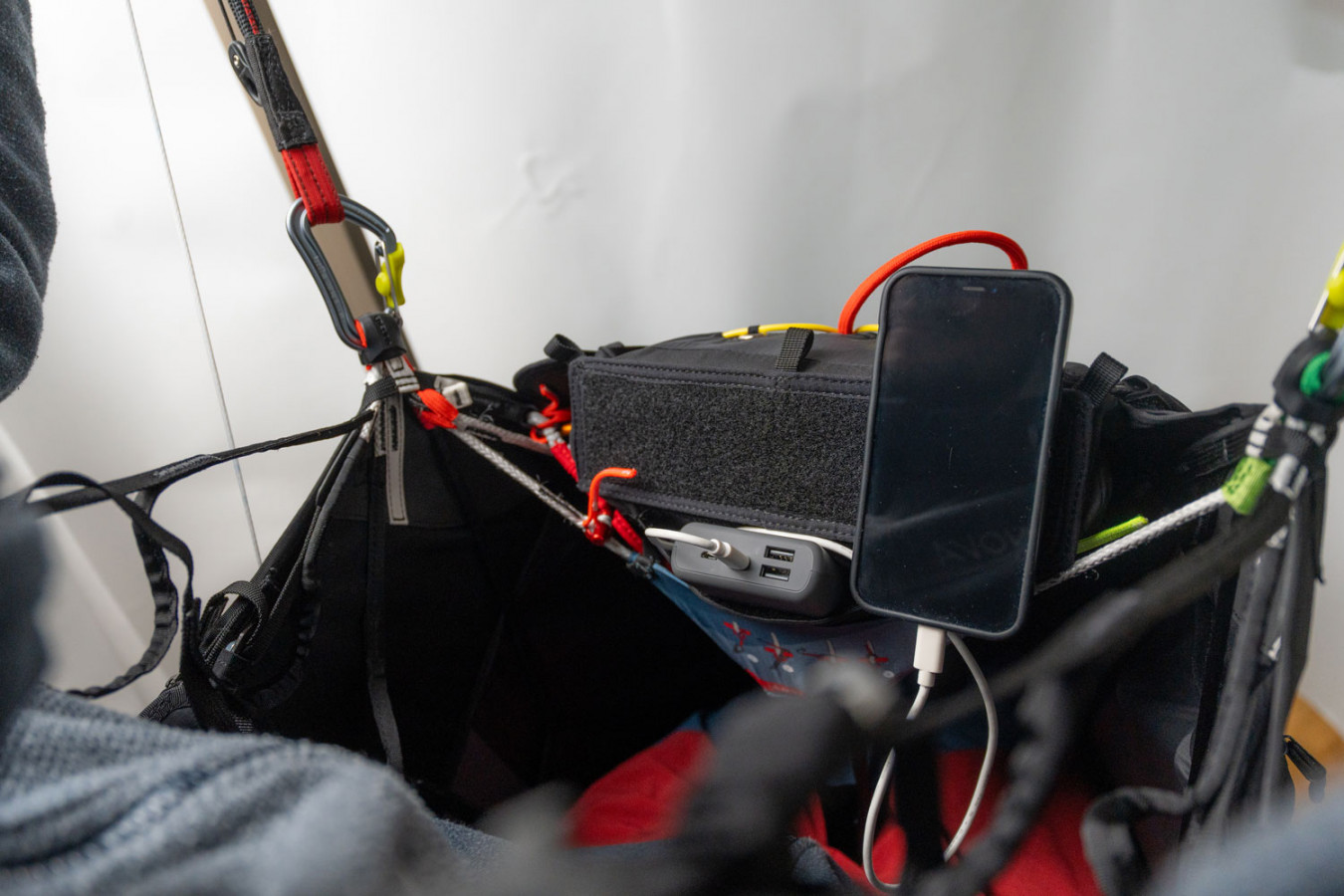 Espace pour l'équipement. L'Artus offre beaucoup d'espace de rangement grâce à ses diverses poches et compartiments. Le compartiment arrière offre le plus d'espace. Il y a une poche zippée sur le côté gauche et droit du pod et il y a également de l'espace sous le siège. La poche kangourou détachable à hauteur de poitrine peut être utilisée pour ranger de petits objets tels qu'une batterie externe ou une barre de céréales. Il y a des sangles Velcro sur le cockpit et les bretelles pour fixer les instruments. Il y a aussi des passages pour la pipette du camelbag et pour le tube d'urine sur la coque extérieure. |