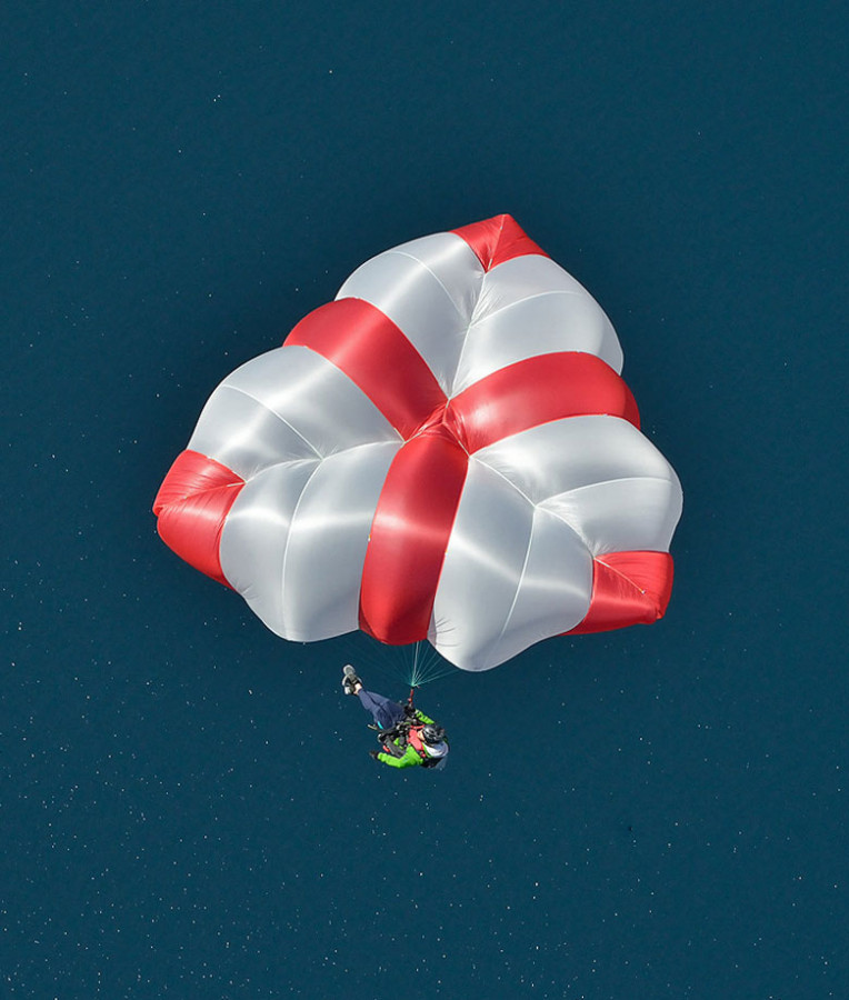 Immédiatement après le déploiement et l’ouverture de la voile, le X-Two s’enfonce verticalement et ne génère aucun mouvement vers l’avant. La voile est entièrement symétrique immédiatement après l’ouverture.