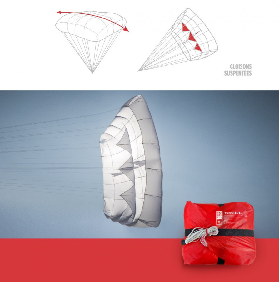 Le Gin Yeti UL est un parachute de secours unique de par son concept « Plan ». Ce concept permet d'obtenir une forme très précise de la coupole, d'augmenter sa surface projetée tout en réduisant sa surface à plat. Le YETI UL est le secours le plus compact et le plus léger du marché offrant de telles performances en taux de chute et en stabilité, accompagné; chose très rare; d'une descente verticale.