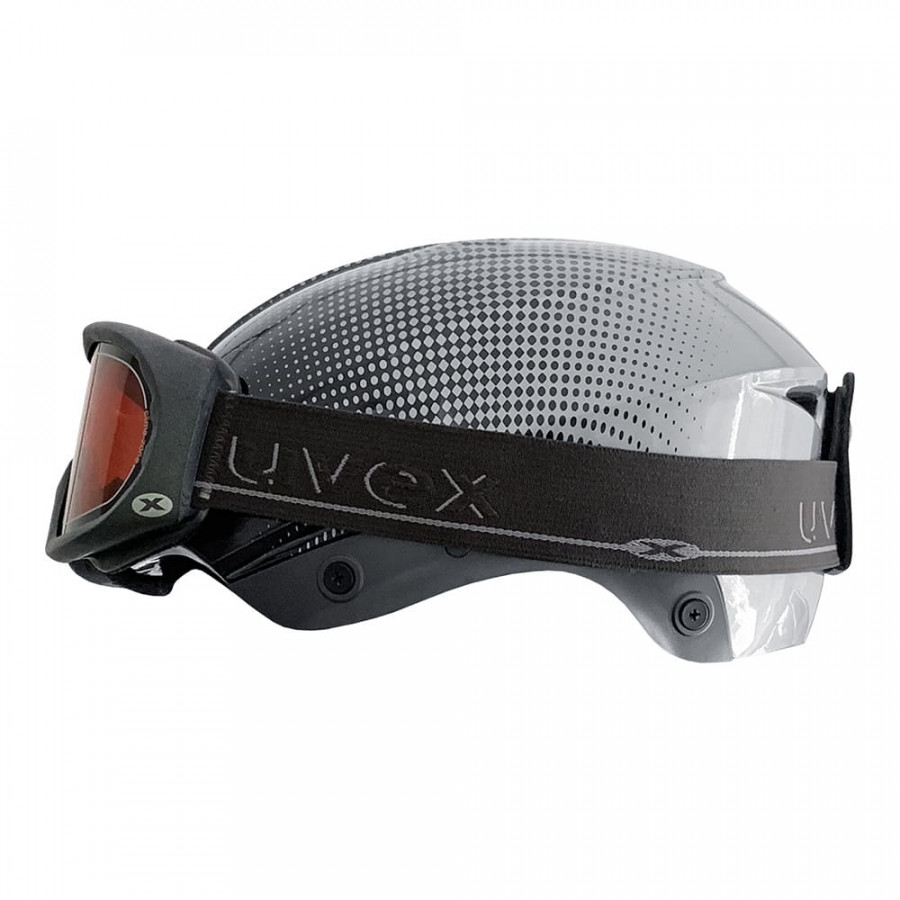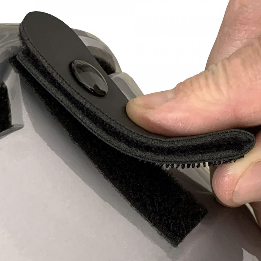 Un morceau de velcro auto-adhésif est appliqué à l'arrière du casque, sur lequel le support peut être fixé. Il peut être facilement ouvert et fermé à l'aide d'un bouton-poussoir pour insérer la sangle du masque de ski.