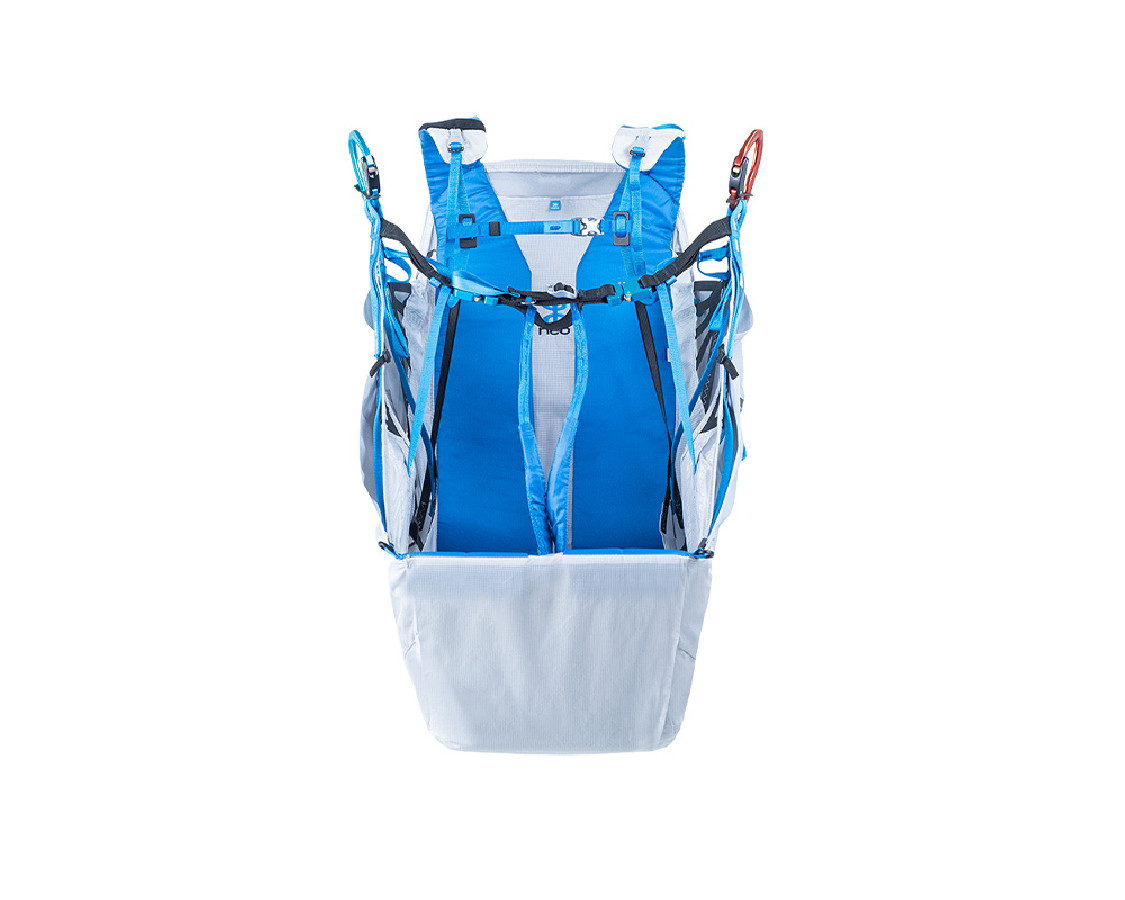 "C'est une nouveauté toute fraîche ! La première sellette assise de chez Neo. Très confortable et légère à la fois. Avec une protection Koroyd, et un secours en ventrale Neo Lite 2. Le système ABS propre à Neo apporte stabilité et précision pour un pilotage optimal. C’est une sellette idéale pour tous les niveaux de vol, pour les vols sur site et les vols rando."