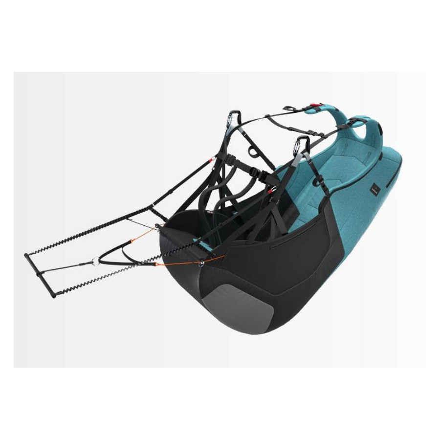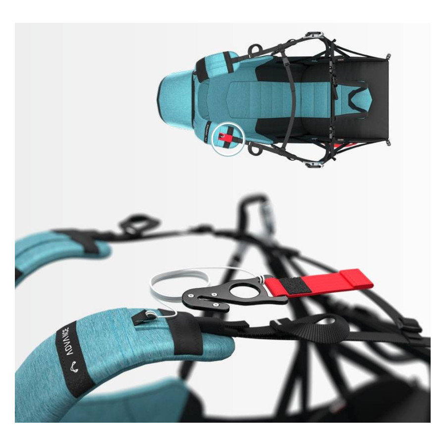 Avec le Balance-Strap-System le pilote peut facilement glisser dans la sellette après le décollage et prendre la position debout avant l’atterrissage. Dès que le pilote redresse les genoux après le décollage il va automatiquement glisser au fond de la sellette, sans l’aide des mains. S’il tend les jambes avant l’atterrissage tout en avançant les hanches, il va automatiquement basculer en avant dans la position verticale de la course au sol. Ce Balance-Strap-System permet de garder les mains sur les freins à l’approche du sol : un autre plus en matière de sécurité.