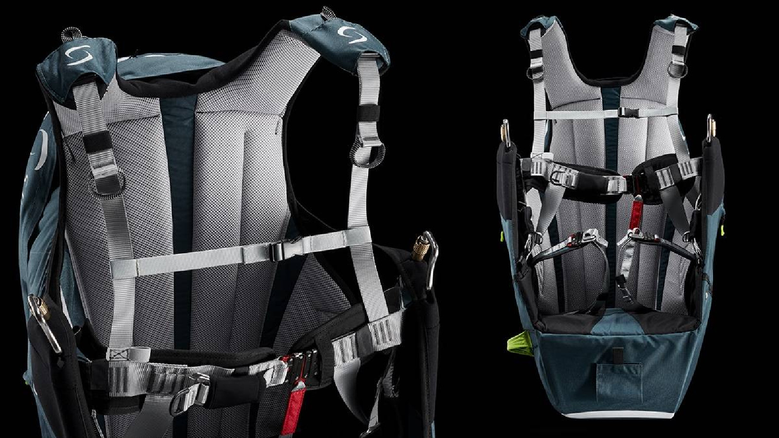 La poche dorsale à soufflets permet de porter du matériel entre deux vols et d’avoir une sellette bien compacte en vol.