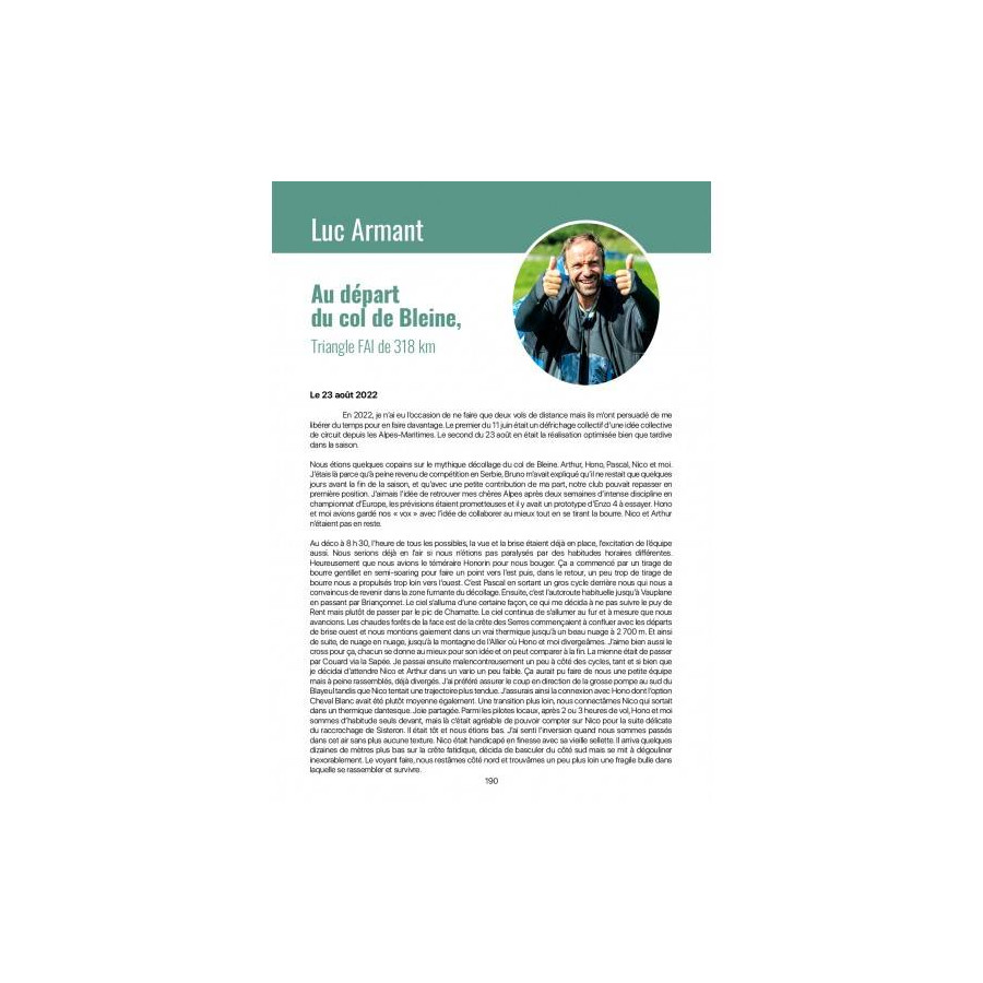 Le livre contient également les récits de 5 vols de légende réalisés par des pilotes d’exception : Timo Leonetti, Luc Armant, Damien Lacaze, Guillaume Chatain et Damien De-Baenst.