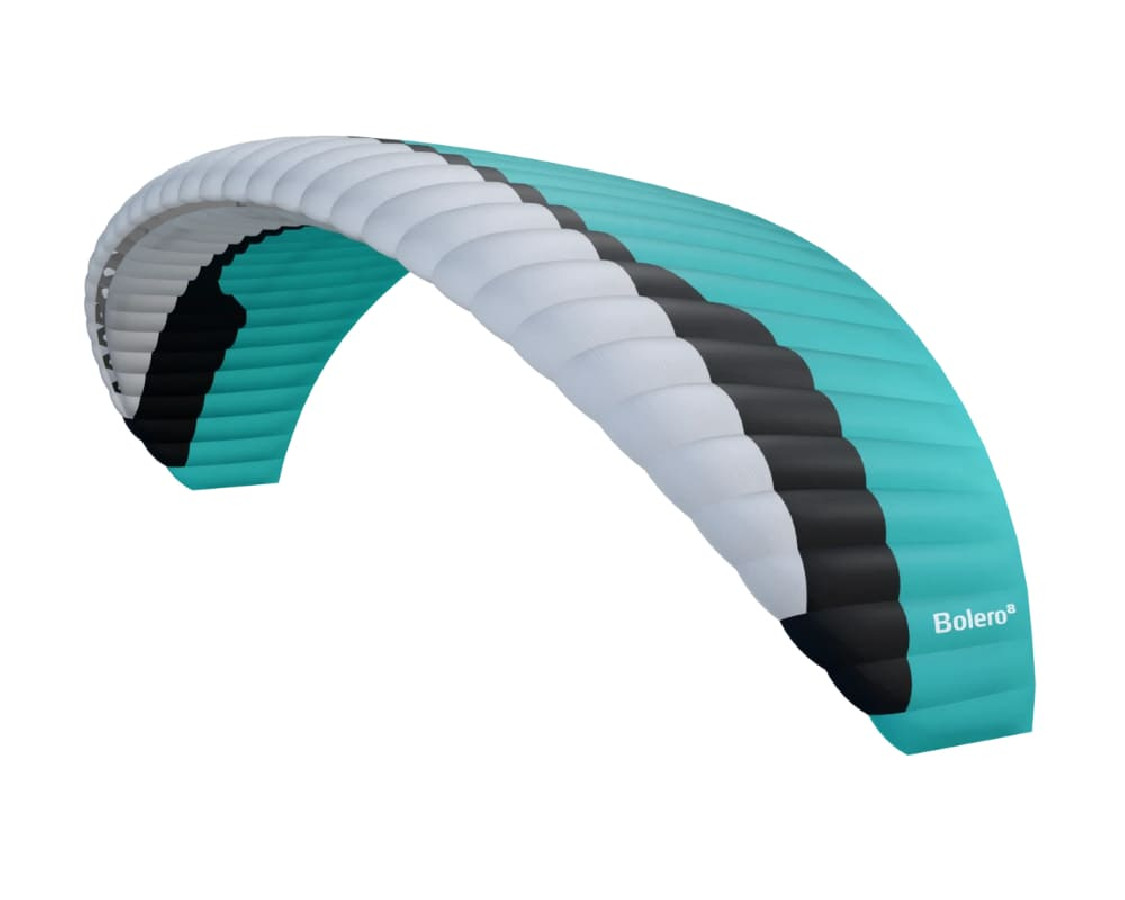 Un profil redessiné et une architecture interne affinée offrent une aile nettement plus homogène. L’amortissement en tangage et en roulis est amélioré sur toute l’envergure, et la résistance aux fermetures est accrue ; la Bolero 8 reste ainsi bien posée en conditions turbulentes et offre aux élèves une plateforme stable pour l’apprentissage.